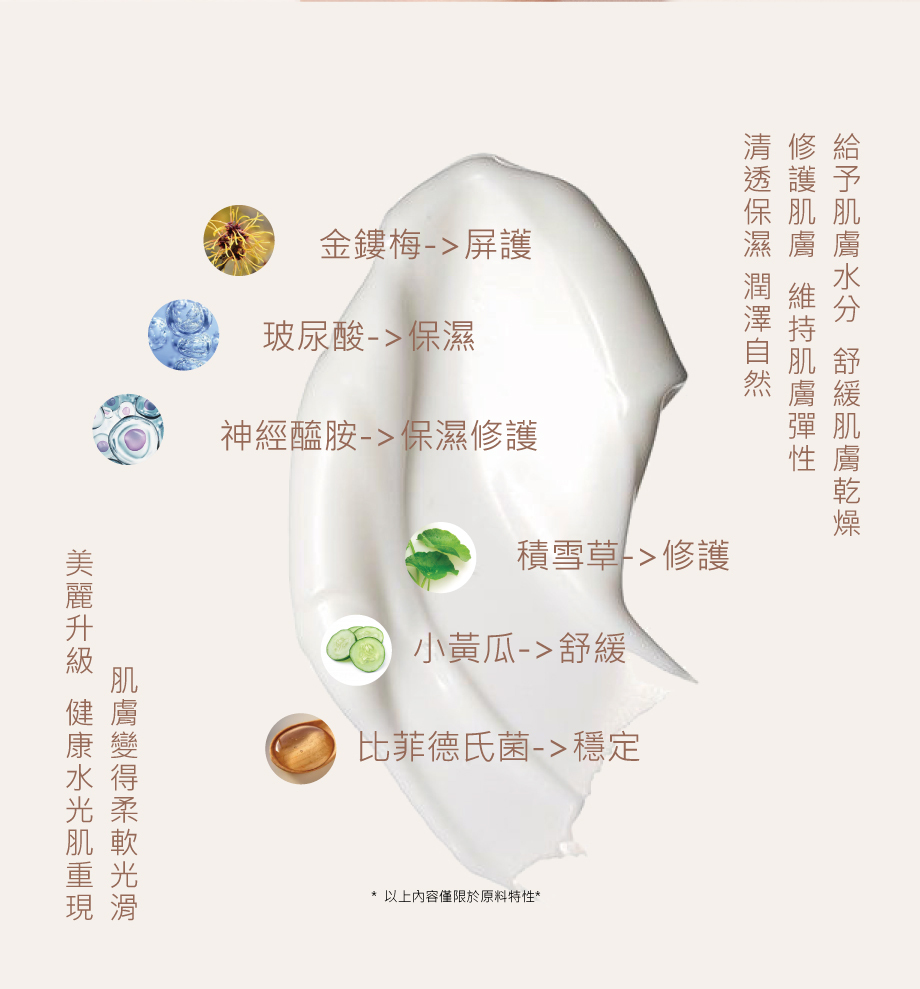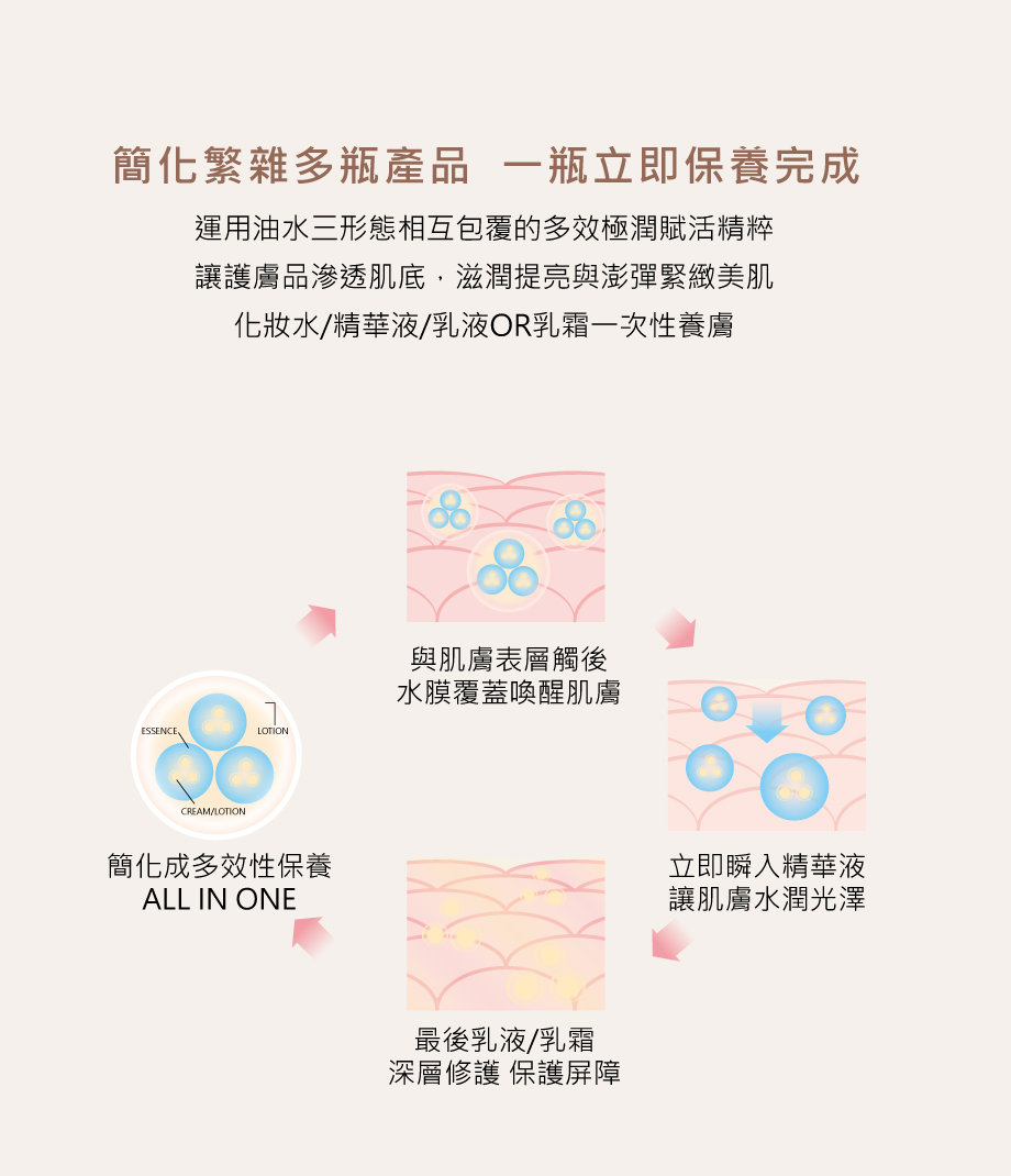 | 商品說明 | 運用三形態油水相互包覆精粹乳劑讓保養有效滲入肌底,同化妝水/精華液/乳液乳霜等劑型立即達到澎‧亮‧潤原生美肌。 |
