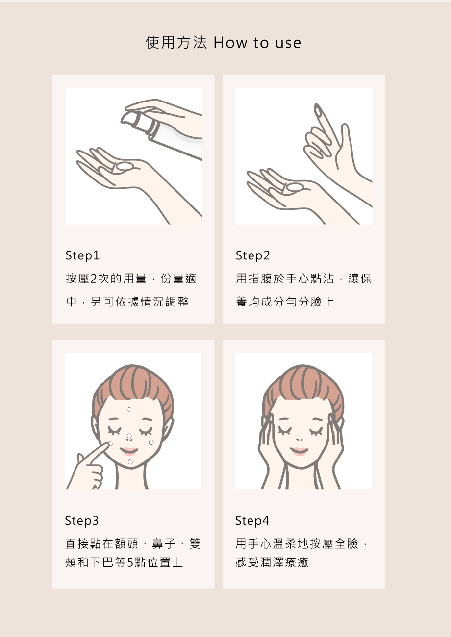洗臉擦乾後,取適量於指腹點上臉部,均勻塗抹與按摩至完全吸收。(避免在手心勻開影響效用) |